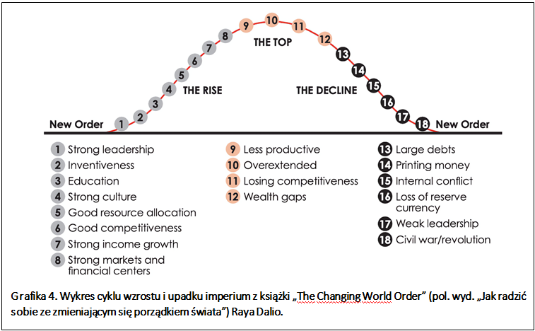 Ray Dalio mierzy siłę imperiów na podstawie ośmiu różnych czynników: 1) edukacja, 2) konkurencyjność, 3) innowacyjność i technologia, 4) produkcja ekonomiczna, 5) udział w światowym handlu, 6) siła militarna, 7) pozycja w byciu centrum finansowym dla świata, i 8) status waluty rezerwowej. We wszystkich tych czynnikach Stany Zjednoczone spadają, a Chiny wzrastają, nawet w ostatnim – czyli statusie waluty rezerwowej – który jak zauważa Dalio jest ostatnim, który upada wraz z upadkiem dominującego imperium.