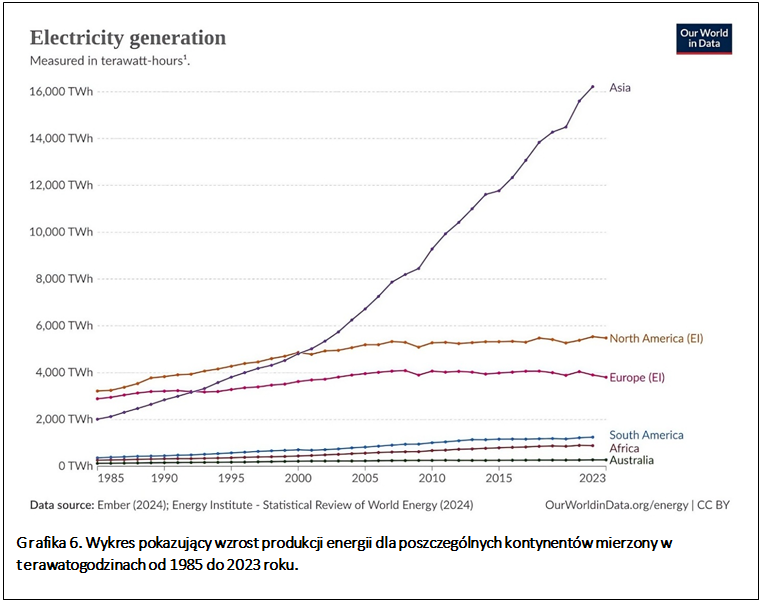 Proszę zerknąć na grafikę nr. 6. Na wykresie produkcji energii widać, że reszta świata stoi w miejscu, tylko Azja idzie do góry. Produkcja i wykorzystanie energii są najbardziej fundamentalnymi czynnikami, według których można zmierzyć siłę danej gospodarki, kraju czy regionu, gdyż wszystko co człowiek robi wymaga energii i im więcej energii mamy do dyspozycji tym mamy większe panowanie nad naturą, czyli większą moc sprawczą.