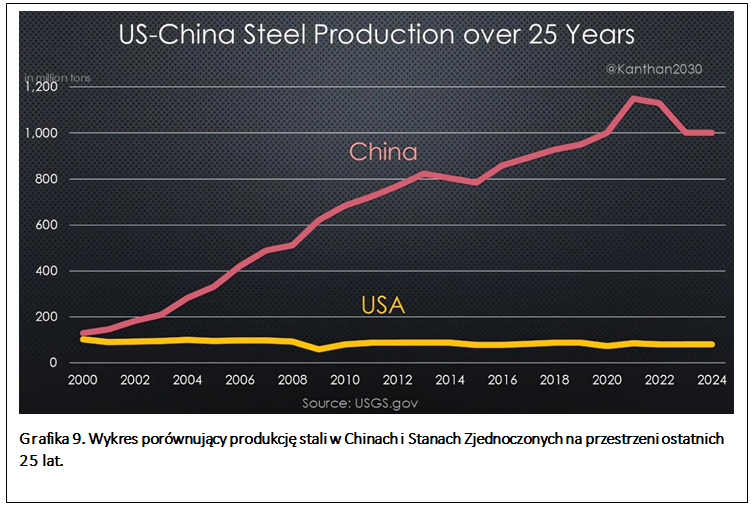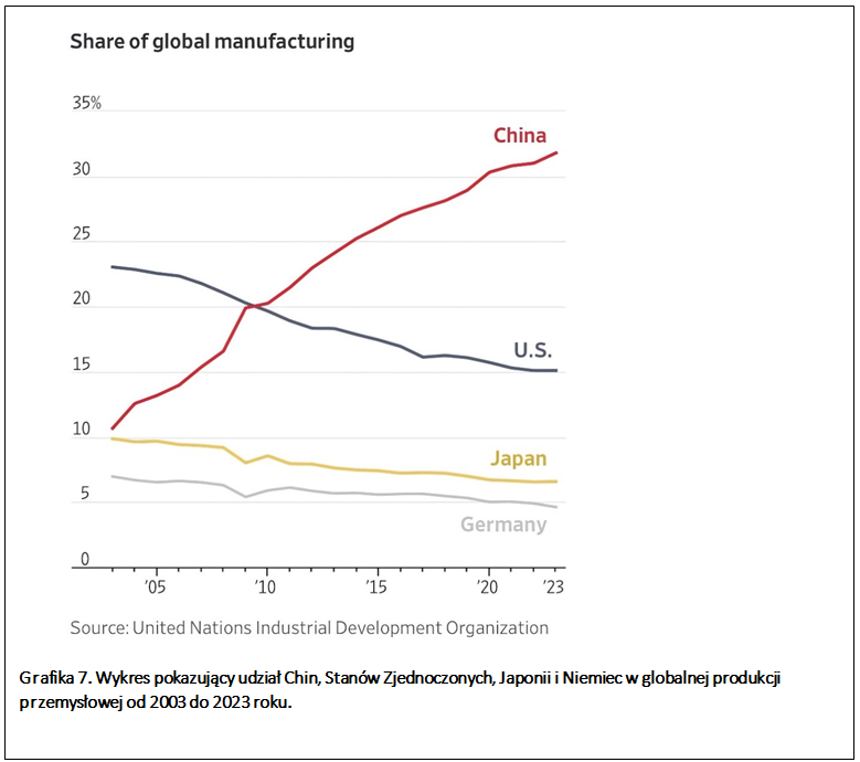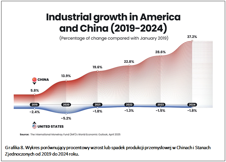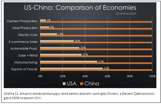 Natomiast na korzyść Chin przemawia wiele innych, znacznie istotniejszych metryk gospodarczych – najważniejszą z nich jest produkcja przemysłowa. Chiny mają prawie 2x większą produkcję przemysłową i prawie 2x większy udział w globalnej produkcji przemysłowej niż Stany Zjednoczone. Ponadto mają około 3x szybszy wzrost produkcji przemysłowej niż USA, tym samym Chiny z każdym rokiem zwiększają swoją przewagę nad Stanami w produkcji przemysłowej. Stany Zjednoczone nadal prowadzą w produkcji leków, w sektorze lotniczym i w przemyśle kosmicznym, ale Chiny doganiają je we wszystkich tych sektorach. Jeśli trendy się utrzymają, Chiny z 30% globalnej produkcji przemysłowej w 2025 roku mogą wzrosnąć aż do 40-45% w latach 2030-tych, osiągając przy tym trzykrotną lub nawet czterokrotną przewagę w globalnej produkcji nad Stanami Zjednoczonymi. Tym samym prawie połowa globalnej produkcji przemysłowej (de facto cała globalna gospodarka) będzie zależała od Chin, na podobieństwo tego jak gospodarka zachodniego świata była zależna od amerykańskiego przemysłu w XX wieku.