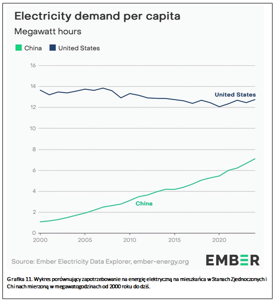 Na wykresie „Electricity generation” widać, że Chiny nadganiają Stany Zjednoczone w wykorzystaniu energii na mieszkańca.