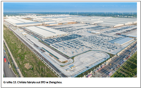 Za przykład wielkiej skali chińskiego przemysłu może posłużyć chińska fabryka pojazdów elektrycznych marki BYD w Zhengzhou. Jest to największa fabryka pojazdów elektrycznych na świecie, i pod względem powierzchni i zdolności produkcyjnych. Obecnie jest około 2.5x większa od największej amerykańskiej fabryki pojazdów elektrycznych (Tesla Gigafactory Texas), ale docelowo, do końca tej dekady, ma być przynajmniej 3-4x większa od największej amerykańskiej.
