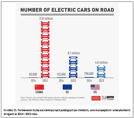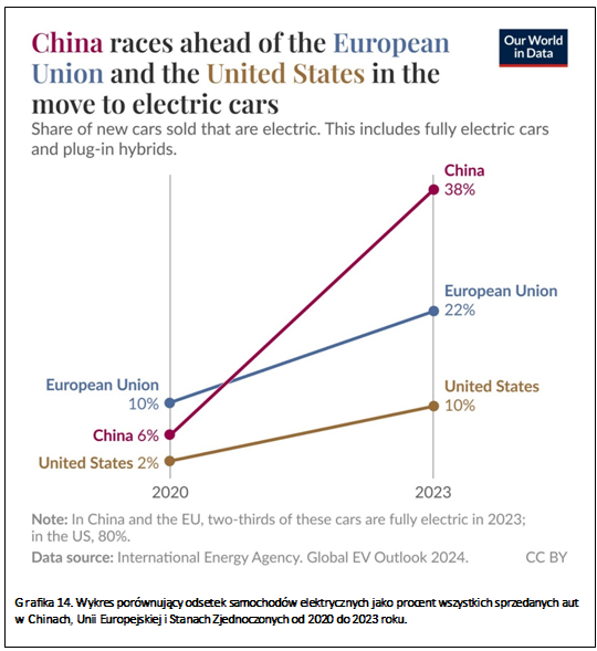 Chiny produkują dziś 2-3x więcej aut niż Stany Zjednoczone, w tym 8-9x więcej samochodów elektrycznych. Licząc na głowę mieszkańca, Stany Zjednoczone nadal produkują 40% więcej aut per capita, ale Chiny za to produkują 2x więcej samochodów elektrycznych per capita. W globalnej produkcji aut Chiny są globalnym liderem z 34% globalnej produkcji, podczas gdy Stany mają 11-12% globalnej produkcji. W sektorze produkcji samochodów elektrycznych Chiny odpowiadają aż za około 71% globalnej produkcji, podczas gdy USA tylko za 8-9%. Ponadto szacuje się, że ten rozjazd pomiędzy Chinami, a USA w produkcji aut będzie się nadal powiększał na korzyść Chin – niektóre prognozy wskazują, że do 2030 roku Chiny mogą osiągnąć blisko 40% globalnej produkcji wszystkich aut. Jako, że przyszłość należy do pojazdów elektrycznych, a Chiny dominują i będą dominować w ich produkcji, to siłą rzeczy ich udział w globalnej produkcji aut będzie rósł.