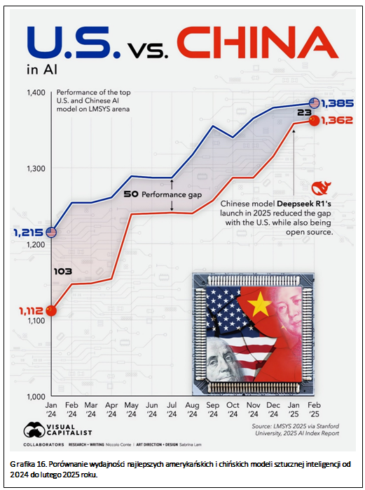 Grafika nr 16 wskazuje, że Chiny doganiają Stany Zjednoczone w wyścigu sztucznej inteligencji.