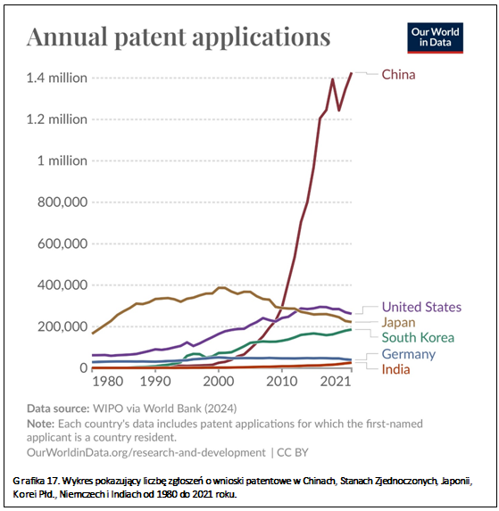 Przez ostatnią dekadę udział Chin w globalnych patentach wzrósł z 35% do około 50%, podczas gdy udział Stanów Zjednoczonych spadł z 20% w 2015 roku do 16% dziś. Tym samym dziś Chiny wydają rocznie tyle patentów co reszta świata łącznie i 3x więcej niż USA. Stany Zjednoczone nadal wydają do 38% więcej patentów per capita niż Chiny i przodują w ich jakości (np. cytowalności), a także prowadzą w innowacjach w niektórych wysokich technologiach (sztuczna inteligencja, biotechnologia), choć chińskie patenty nadrabiają szybko obie luki.