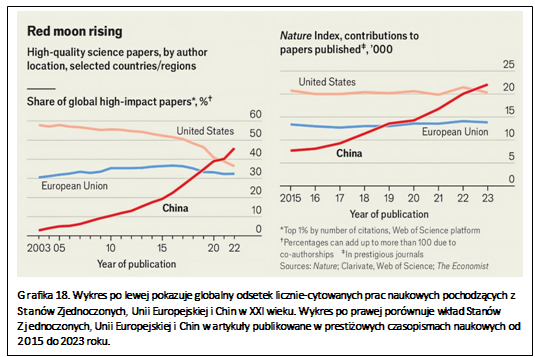 Według raportów ASPI (Australian Strategic Policy Institute), i innych, w 2015 roku Chiny prowadziły tylko w 30-45% sektorów krytycznych technologii nad Stanami Zjednoczonymi, a dziś prowadzą już w prawie 90%. Prognozy wskazują, że jeśli nic się nie zmieni, to przewaga Chin w obszarze krytycznych technologii urośnie jeszcze bardziej do 2030 roku (do 90-95%).